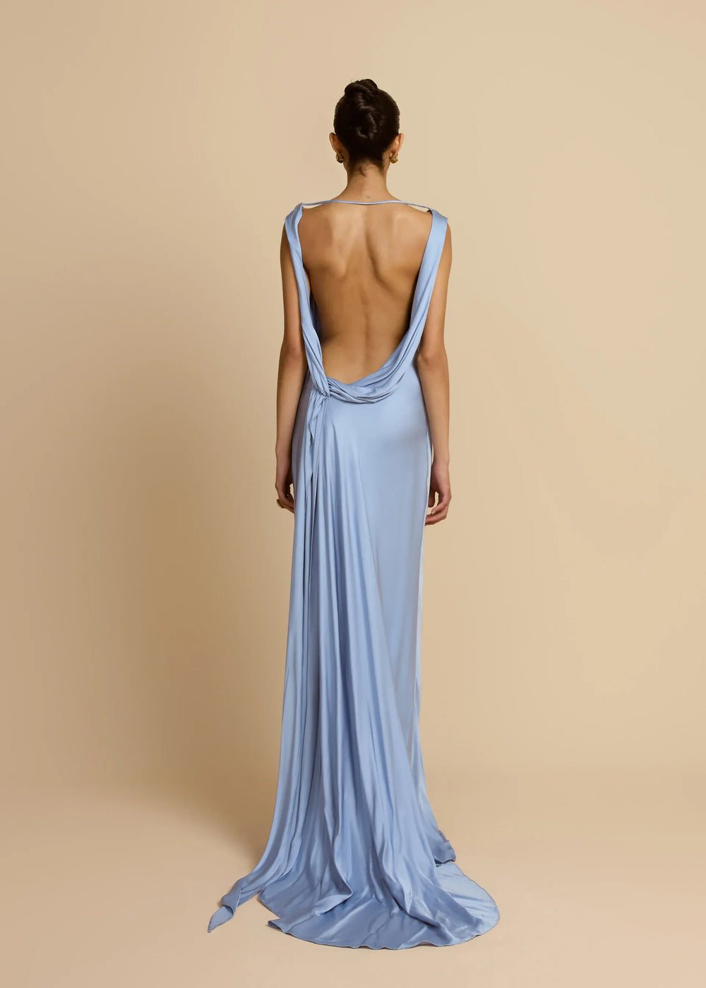 Sleek maxi with a graceful cowl neck and dramatic open back—perfect for formal weddings and gala events.